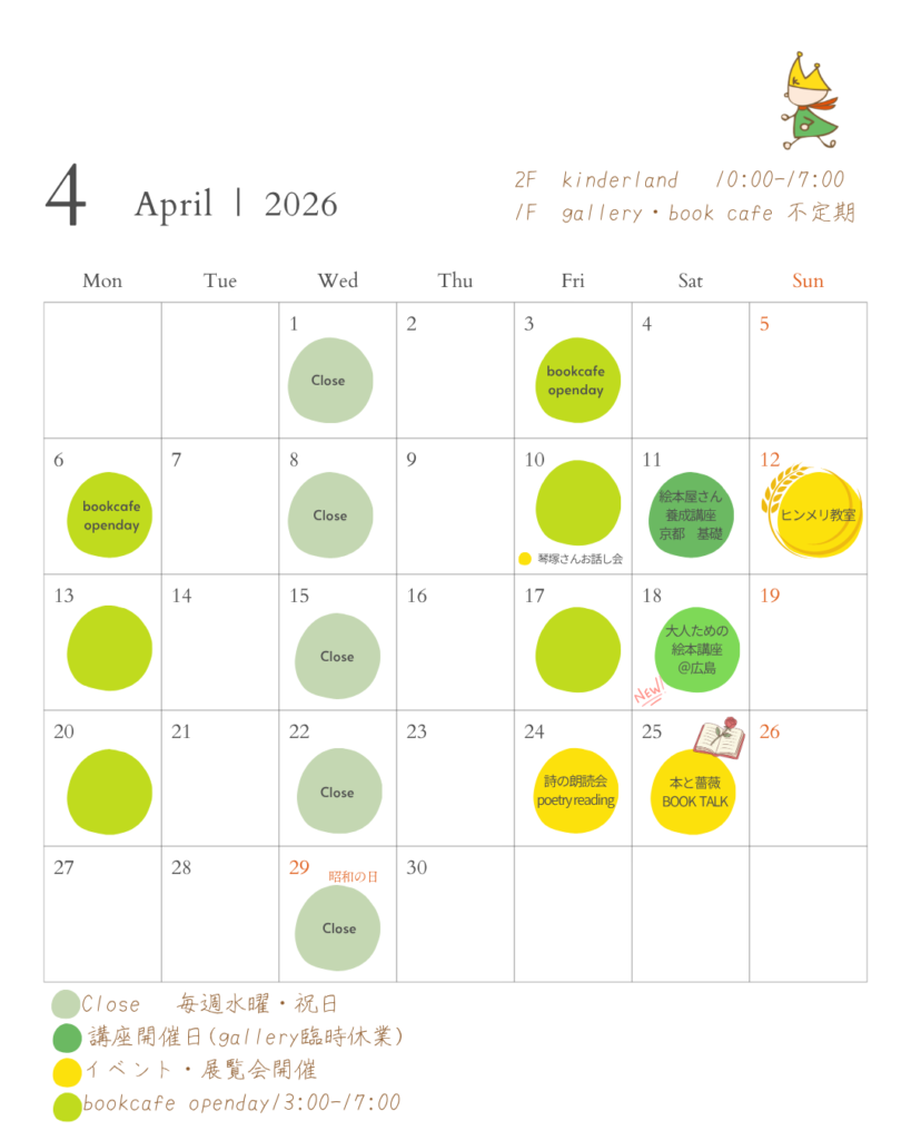 ギャラリーでは、絵本の原画展を中心に、きんだあらんどおすすめの展示会やイベントを企画開催しております。毎回、展示期間中には、楽しいイベントやワークショップを開催いたします。